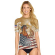 The One Nation Under God Women's Short Sleeve Rash Guard balances comfort and support, making it suitable for a wide range of sports. Whether you're into MMA, Brazilian Jiu Jitsu, Jiu Jitsu, Muay Thai, No Gi Jiu-Jitsu, Grappling, Wrestling, Kick Boxing, Gym workouts, Crossfit, or general fitness, this rash guard has got you covered.