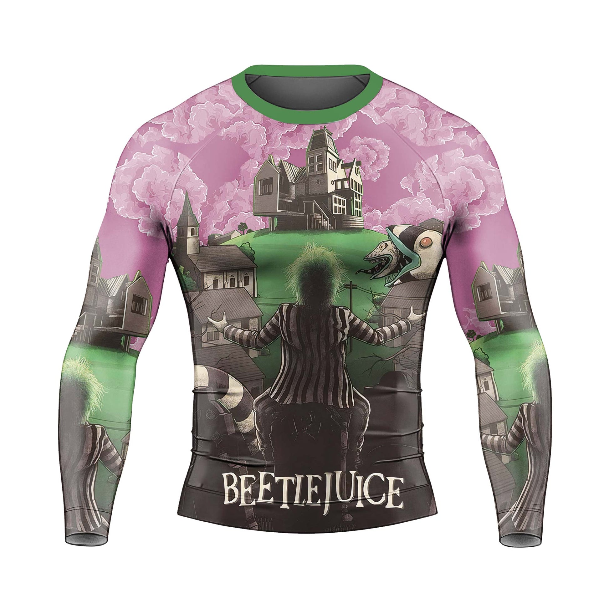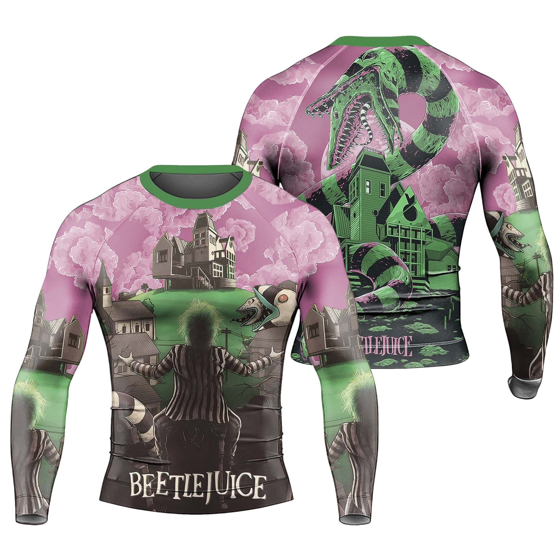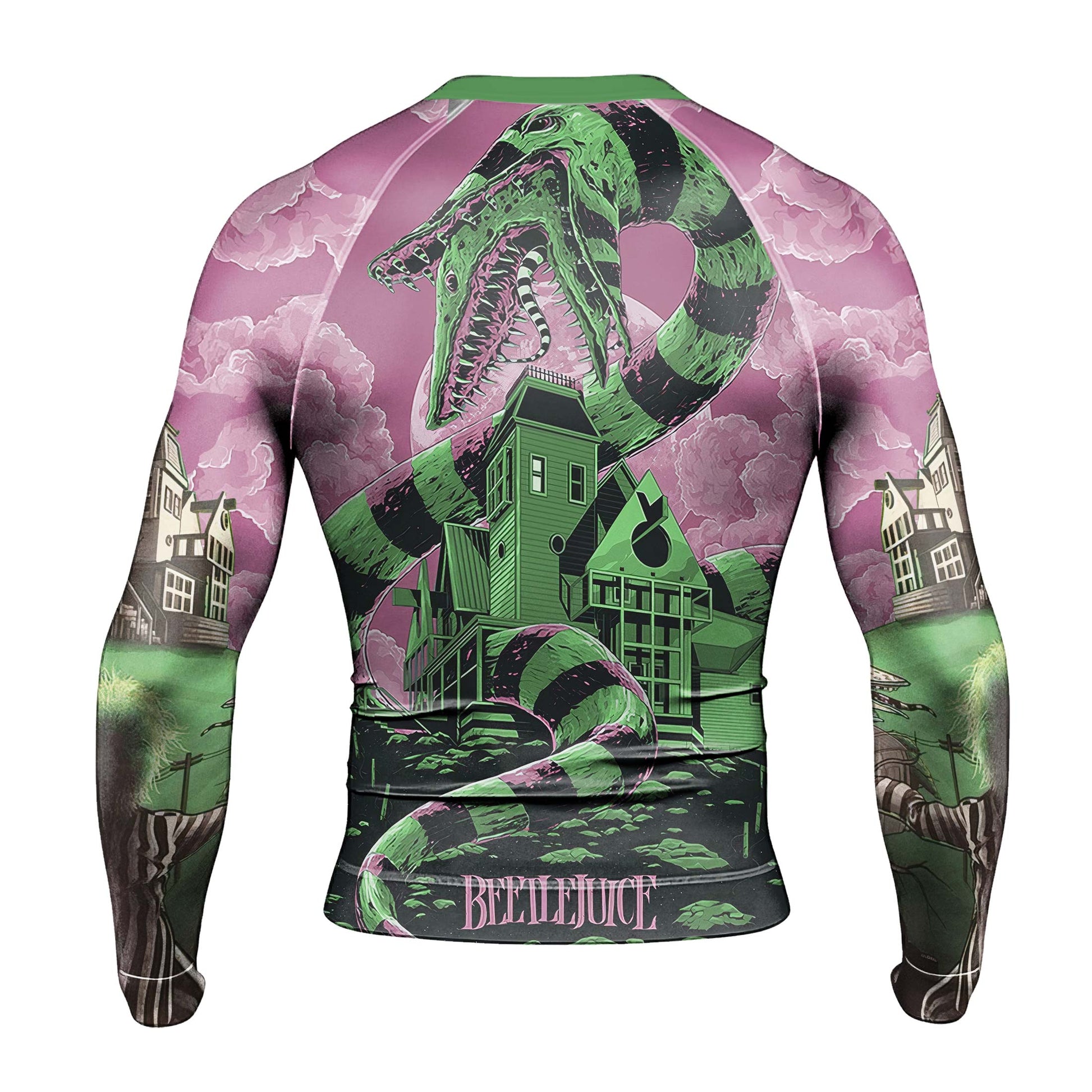 The Sandworm Beetlejuice Men's Long Sleeve Rash Guard is designed to provide athletes and fitness enthusiasts with the ultimate in comfort and performance. Crafted from a high-quality blend of Polyester and Spandex, this rash guard offers a second-skin fit that ensures full flexibility and freedom of movement. Whether you're executing complex fighting moves or striking a pose, this rash guard supports your every move.