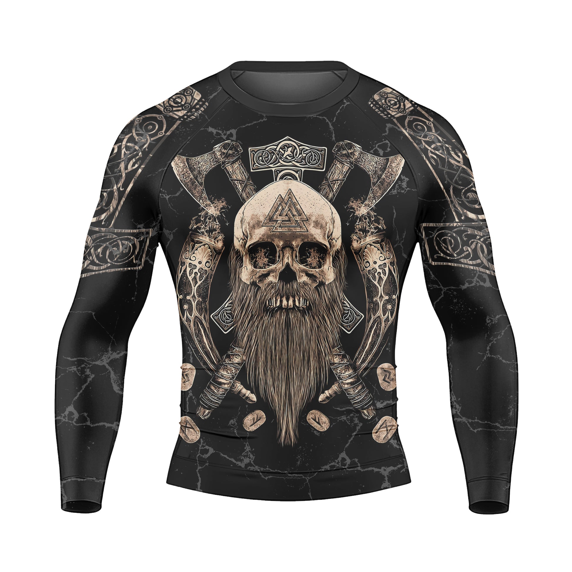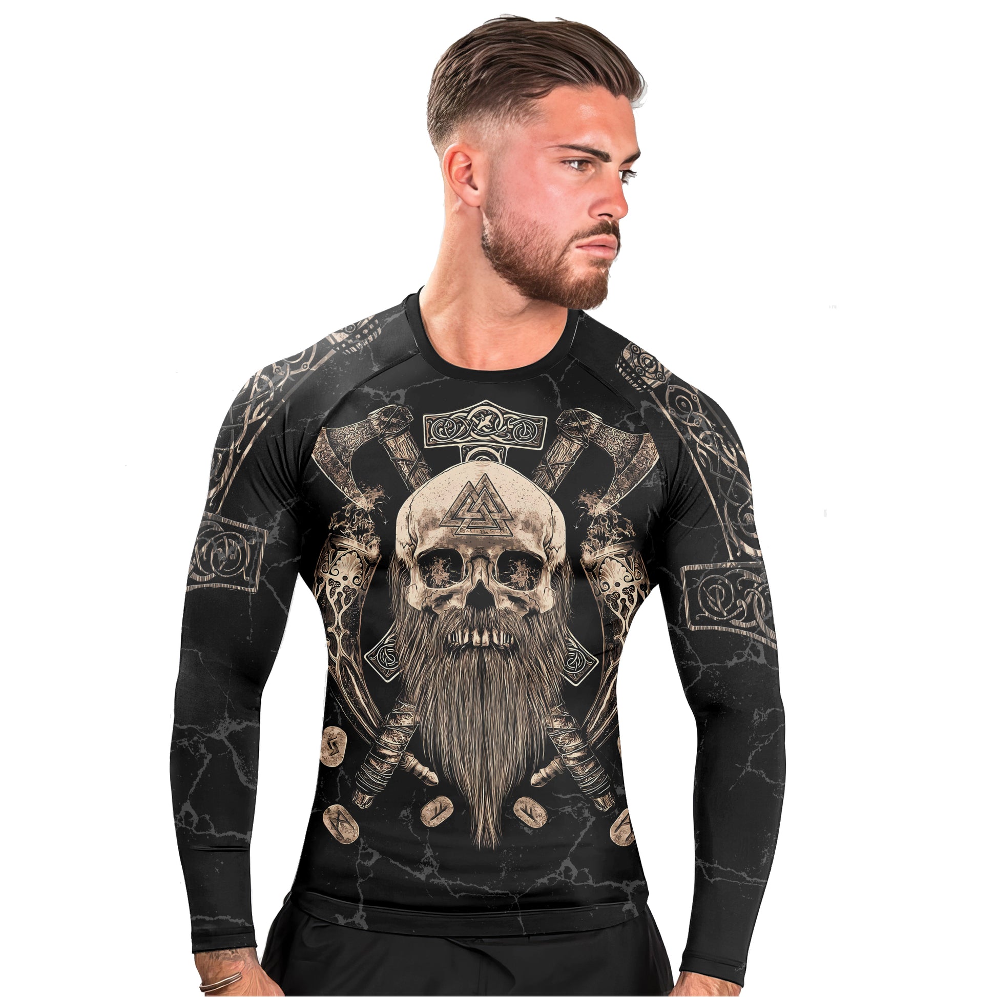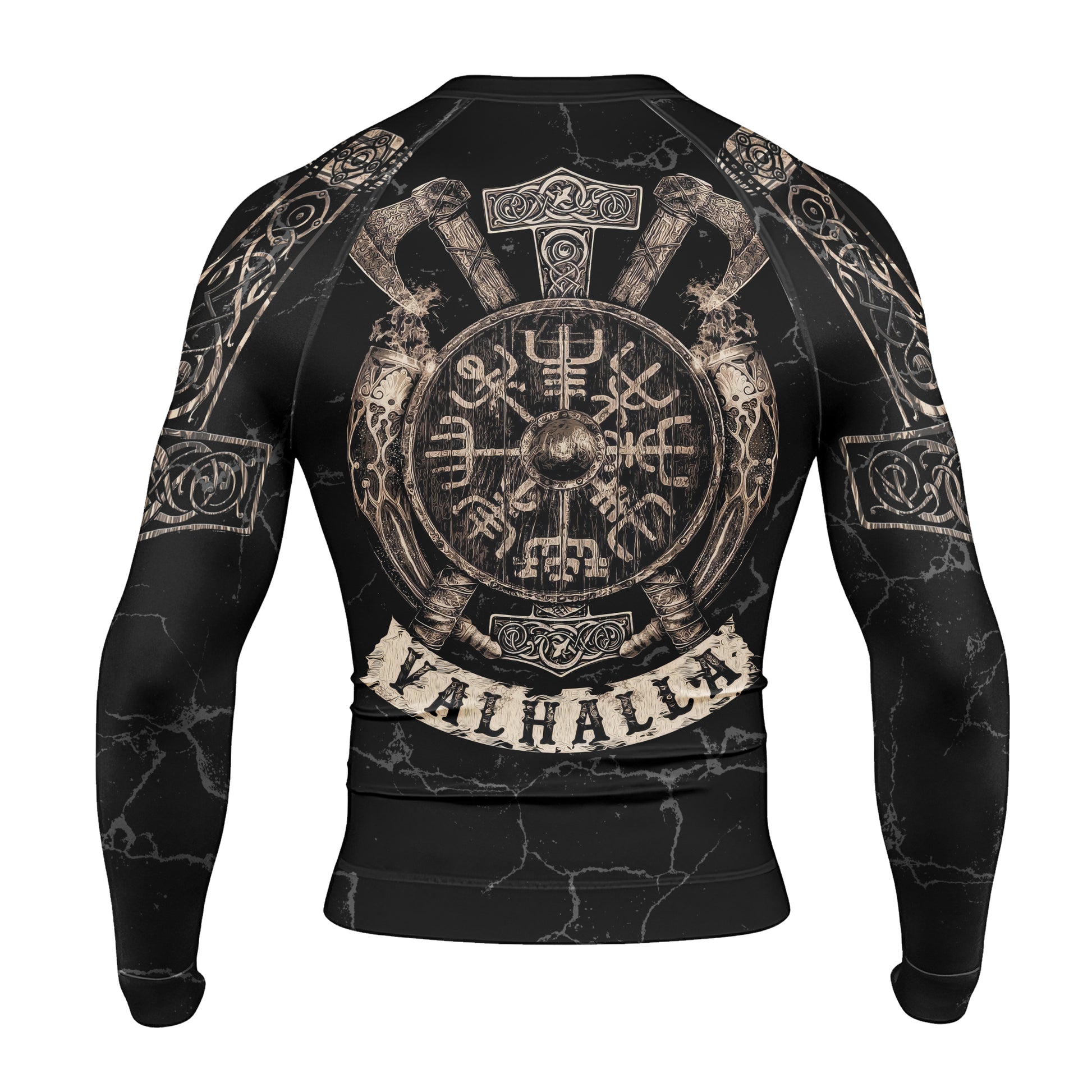 The Vegvisir Valhalla Men's Long Sleeve Rash Guard is crafted for athletes who demand functionality, style, and durability from their sportswear. Engineered with a high-quality blend of polyester and spandex, this long sleeve rash guard offers an ergonomic, compression fit that supports your muscles and maximizes freedom of movement. Whether you are training in MMA, Brazilian Jiu Jitsu, wrestling, or hitting the gym, experience the confidence and flexibility offered by the Valhalla collection.