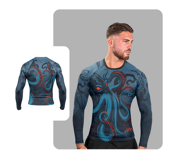 The Dark Sea Octopus Men's Long Sleeve Rash Guard, a high-performance compression shirt designed to meet the rigorous demands of athletes across various sports disciplines. Crafted from a blend of Polyester and Spandex, this rash guard offers a second-skin fit that ensures full flexibility and freedom of movement, allowing you to execute any fighting move or pose with ease.